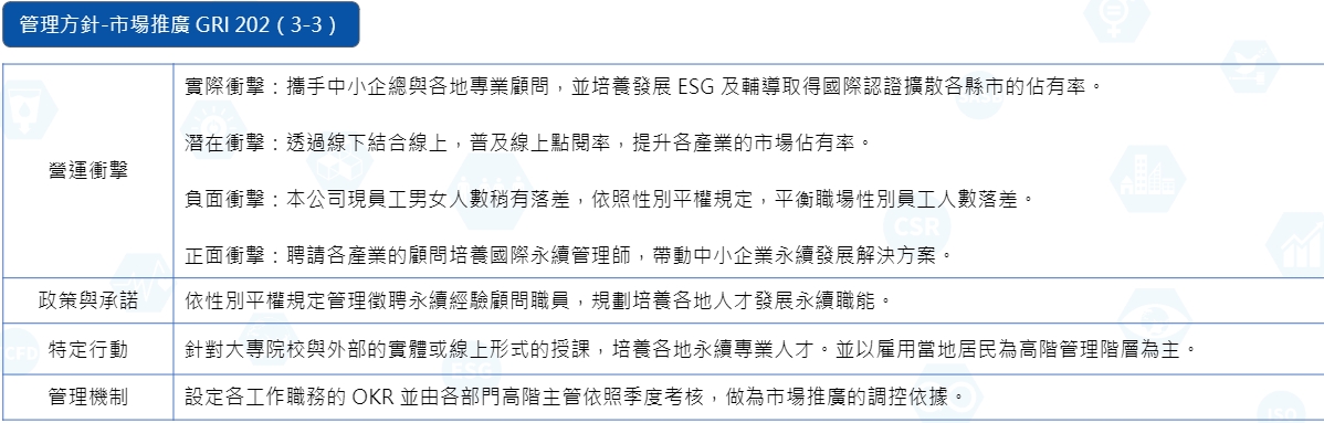 ※上圖相關人力配置之區域性,100% 雇用高雄市當地居民(202-2),除了為當地居民提供更多的就業性可能外,也先將薪傳智庫的永續發展概念深入高雄這塊土地。
